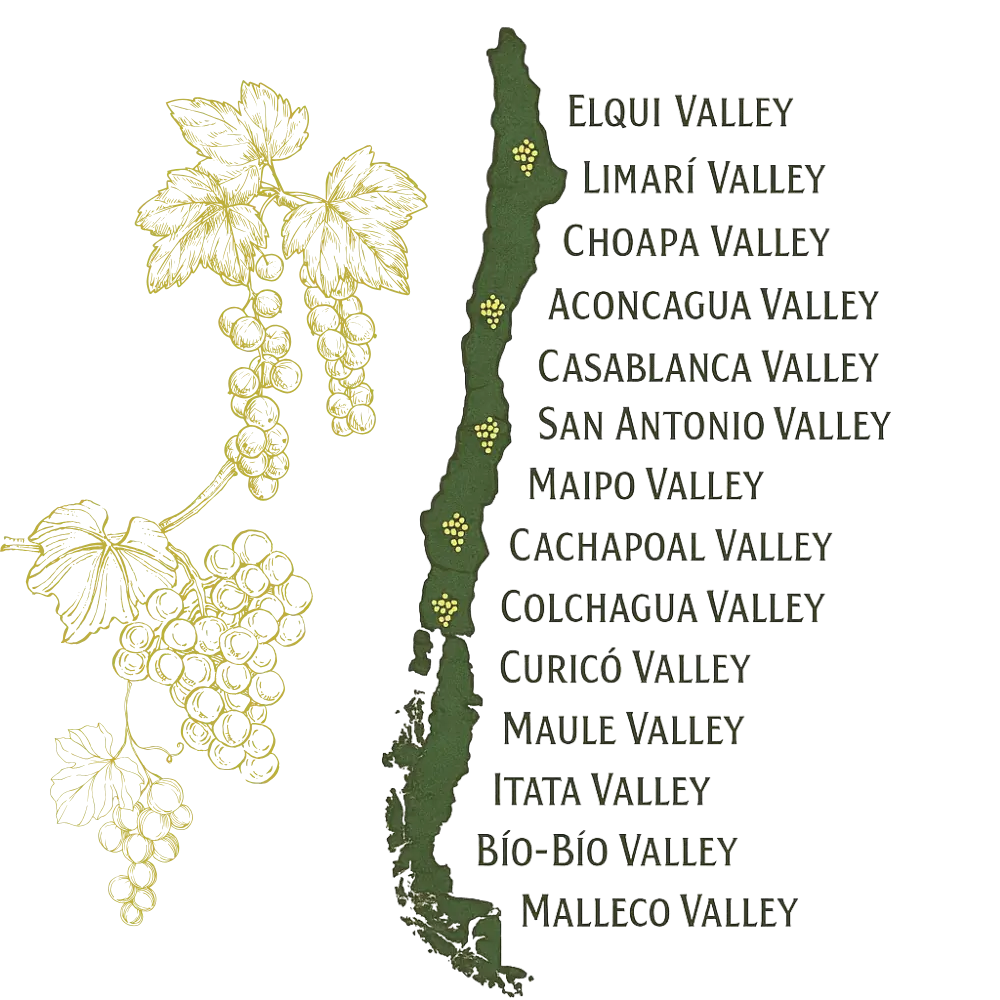 Chili’s wijnlandschap strekt zich uit van de droge, zonnige Elqui Valley in het noorden tot het koele, groene Malleco Valley in het zuiden. Elke regio heeft zijn eigen karakter: van de krachtige rode wijnen uit Maipo en Colchagua tot de frisse, elegante witten uit Casablanca, San Antonio en Bío Bío. Dankzij extreme geografische contrasten (de oceaan, Andesgebergte en de woestijn) biedt Chili een ongekende diversiteit aan terroirs en smaken.